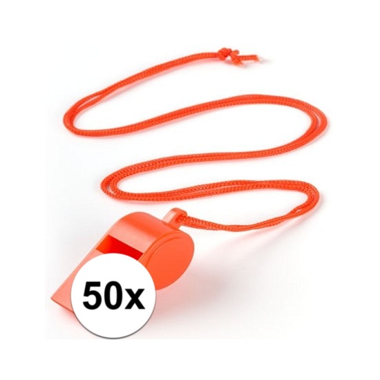 *Set van 50x Stuks oranje kunststof fluitjes met koord*