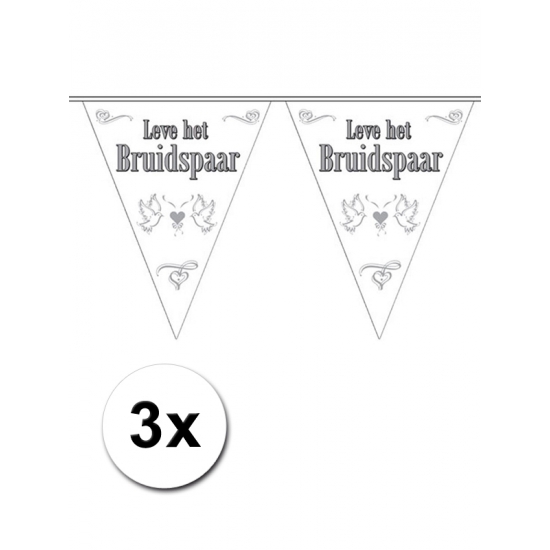 3 stuks versier de feestlocatie in stijl met deze vrolijke vlaggenlijn met de tekst Leve het bruidspaar. De lijn is in totaal ongeveer 10 meter lang, waarvan 6 meter voorzien is van dubbelzijdige vlaggetjes van stevig pvc. Aan beide uiteinden zit 2 meter koord om de lijn eenvoudig op te hangen. Ideaal voor binnen- of buitendecoratie tijdens een huwelijksfeest. Let op: dit product is niet brandvertragend.