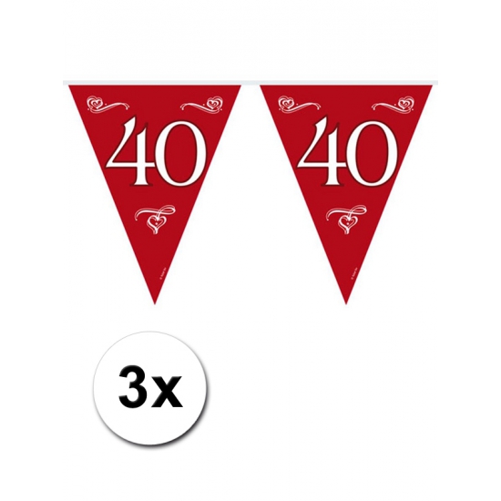 3x vlaggenlijnen van 40 jaar jubileum/getrouwd thema. Rode vlaggenlijnen met daarop in grote cijfers 40 op ieder vlaggetje. De vlaggenlijn is in totaal 10 meter lang, met 2 meter lint aan beide uiteinden en vlaggetjes in de middelste zes meter per stuk. Feestartikelen/versieringen. Materiaal: plastic.
