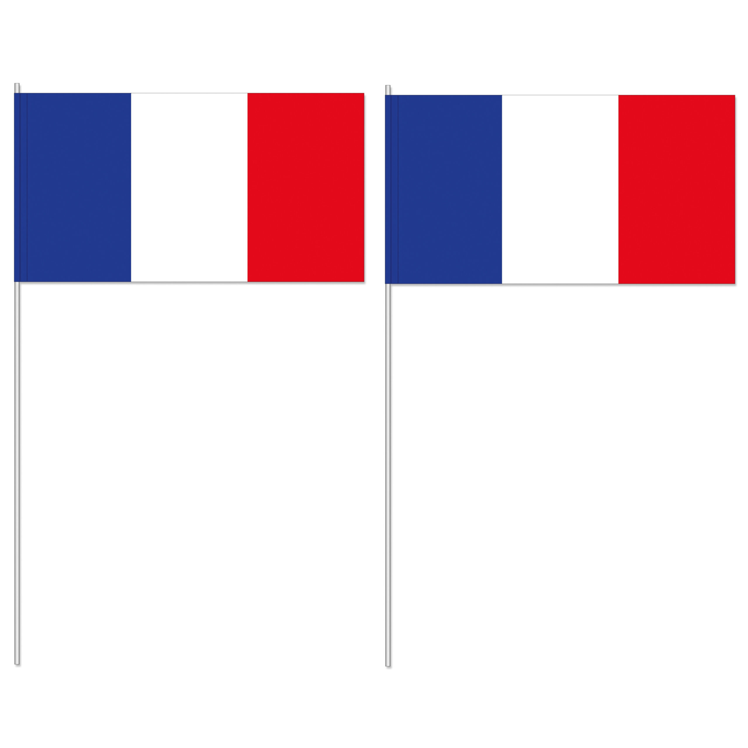 100x frankrijk zwaaivlaggetjes – 12 x 24 cm – papieren vlag – met stokje 40 cm. Papieren zwaaivlaggetjes met de Franse vlag in blauw, wit en rood. Ideaal voor sportevenementen, themafeestjes of nationale vieringen zoals Quatorze Juillet. De vlaggetjes hebben een formaat van ca. 12 x 24 cm en zijn bevestigd aan een stevig kunststof stokje van ongeveer 40 cm lang. Licht van gewicht en perfect om mee te zwaaien of uit te delen.