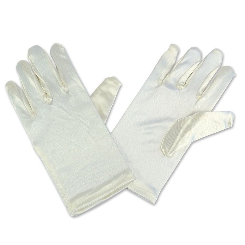 Gebroken witte satijnen handschoenen King of Pop voor kinderen. Korte ivoorkleurige Michael Jackson handschoenen met de uitstraling van satijn, geschikt voor kinderen. Een leuke toevoeging bij een verkleedoutfit! Maat: Omvang ca. 15 cm, lengte middelvinger ca. 6 cm. Materiaal: 100% polyester.