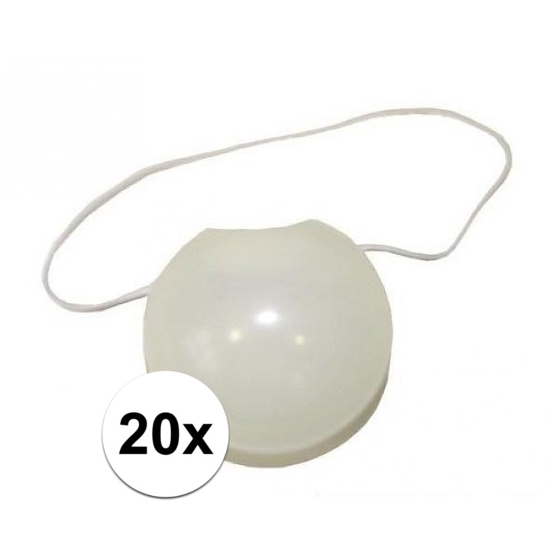 20x Glow in the dark clowns neus. Deze clownsneuzen met elastiek licht op in het donker. Materiaal: plastic.