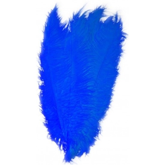 2x grote veer/struisvogelveren in het blauw van 50 cm. Verkleed accessoires veertjes. Deze spadonis sierveren zijn afkomstig van de struisvogel. Formaat ongeveer: 50 cm. Charleston thema verkleed decoratie vogelveren in de kleur blauw voor carnaval of een themafeest zoals Roaring Twenties. Ook geschikt als Pietenveer.