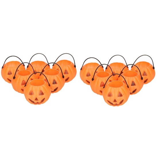 12x halloween pompoen emmers 6 stuks. Set van zes kleine decoratie emmertjes met een afmeting van ca. D7 x H5 cm, incl. handvat ca. 7,5 cm. Materiaal: plastic. Halloween decoratie/versiering emmertjes pompoenvorm. Ook leuk als uitdeel cadeautje met snoepjes erin!