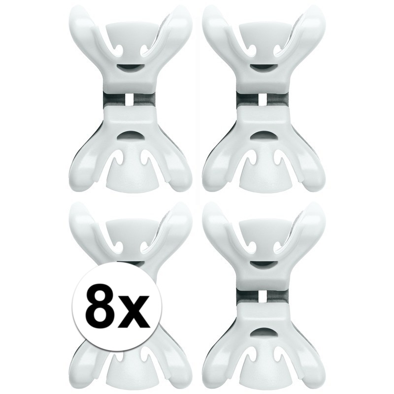 8x stuks feestslingers/decoratie ophangen hoekklemmen wit. Set van slingerklemmen van kunststof met RVS. Met deze klemmen kunt u slingers en decoratie ophangen zonder gebruik van plakband, spijkers of punaises. Gebruik: Knijp, plaats, laat los. U hoeft de klem niet in de muur of het plafond te drukken, de klem klemt zichzelf vast tussen muren of tussen muur en plafond. Maximaal draaggewicht: 1,5 kg. Formaat per stuk: 6,5 x 4,2 x 2,4 cm.