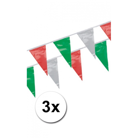 3x vlaggenlijn groen/rood/wit. Vlaggenlijnen in de kleuren rood/groen/wit en heeft een lengte van ongeveer 4 meter per lijn. Materiaal: Folie. Afmeting vlaggetjes: 16 x 27 cm.