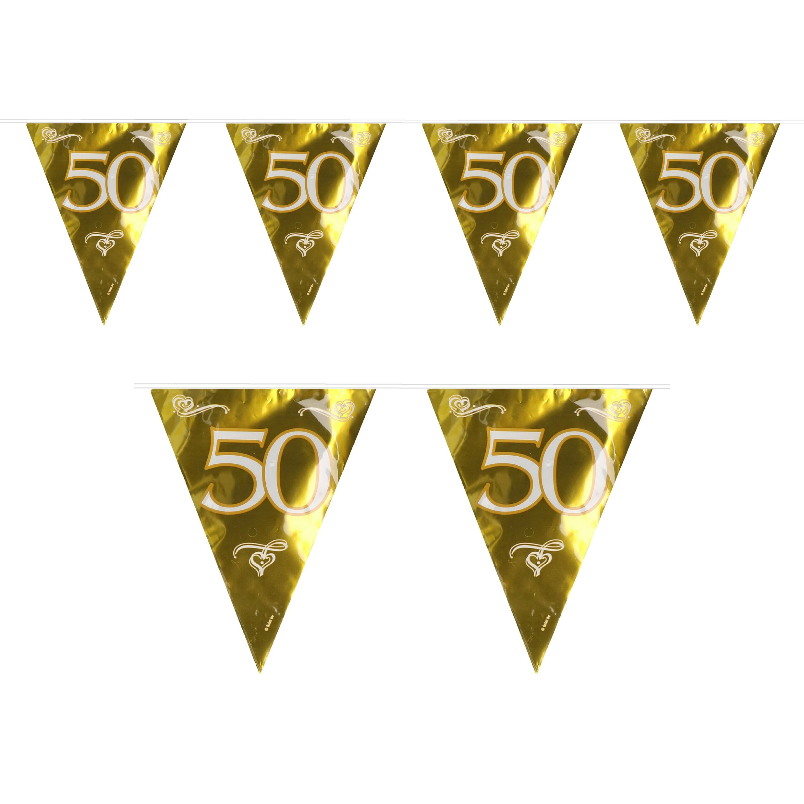 3x jubileum of leeftijd thema vlaggenlijn van 50 jaar. Gouden plastic vlaggenlijnen voor een 50 jarig jubileum of bruiloft of voor een verjaardagfeestje. Formaat: ongeveer 6 meter, incl. uiteinden. Feestartikelen en versieringen.