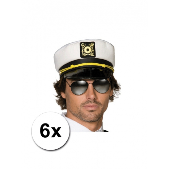 6x kapiteins pet voor volwassenen. Kapiteins pet voor volwassenen in de kleur wit met zwarte klep. De pet is one size, ongeveer maat 59. Voor meer kapiteins accessoires kunt u ook in onze webshop terecht.