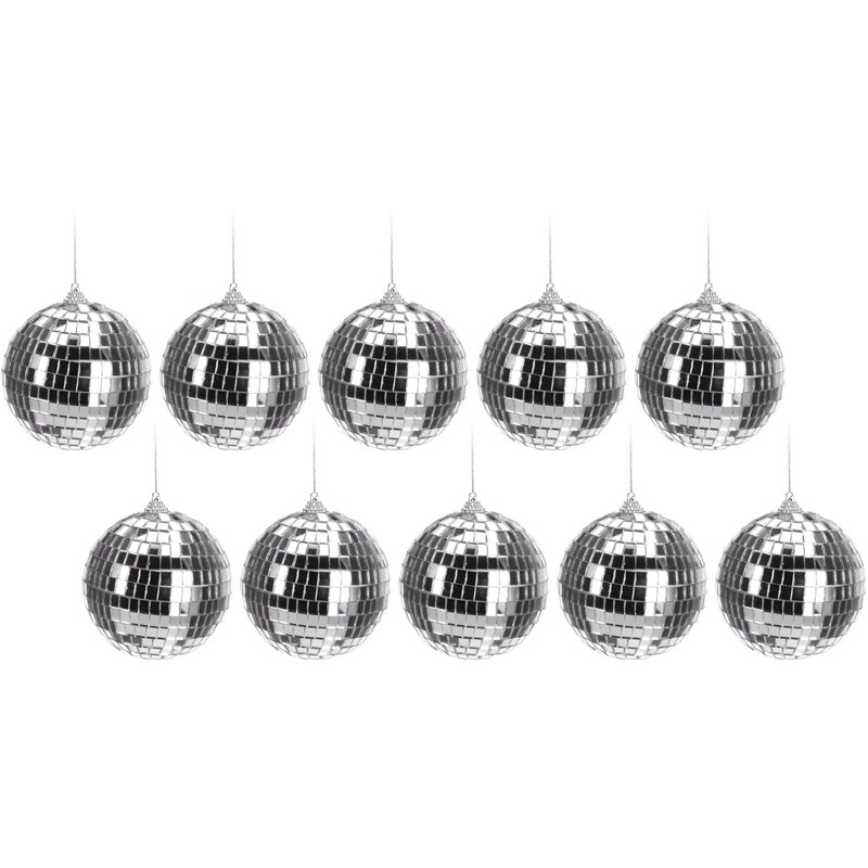 10x spiegel disco kerstbal. Voeg een feestelijke en sprankelende touch toe aan je kerstdecoraties met deze zilveren discobal. Met een diameter van 10 cm, is deze kerstbal ideaal voor het cre?ren van een levendige en feestelijke sfeer. De kerstbal is vervaardigd uit piepschuim en afgewerkt met glazen spiegeltjes, waardoor hij een schitterend spiegelend effect geeft. Deze spiegelbol kan zowel in de kerstboom als aan het plafond worden gehangen, en voegt een gezellige disco-kerstsfeer toe aan je interieur.