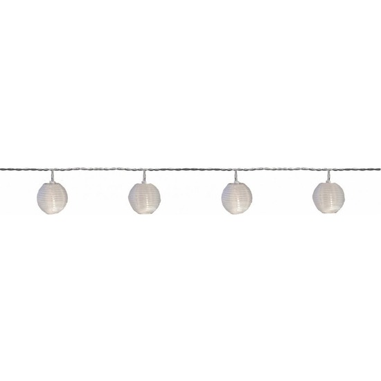 Soort verlichting: LED. Kleur licht: warm wit. Kleur snoer: wit. Totale lengte lichtsnoer: 17,2 meter. Lengte snoer met lampjes: 7,2 meter. Aantal lampjes/lampionnetjes: 24. Diameter per lampion: 7,5 cm. Lengte aanloopsnoer: 10 meter. IP44 spatwaterdicht. Aansluiten op een geaard stopcontact wordt aangeraden.