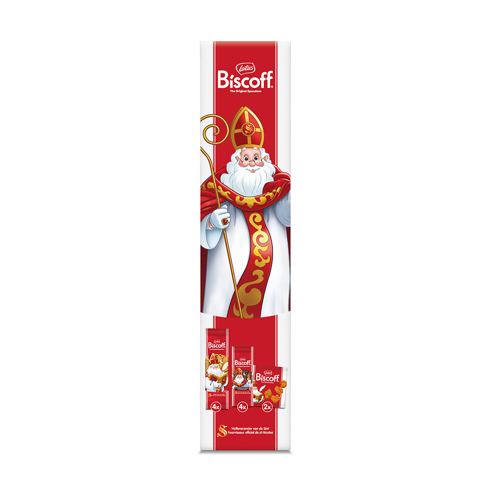 Zie ginds komt…. de Sint! Ook dit jaar heeft hij zijn lekker knapperige speculoos van Lotus meegebracht, verpakt in een schoorsteendoos. Deze box van 360g bevat 4 zakken Speculoos Mini’s, 4 zakken Klaasmannen Natuur en 4 zakken Klaasmannen Choc.