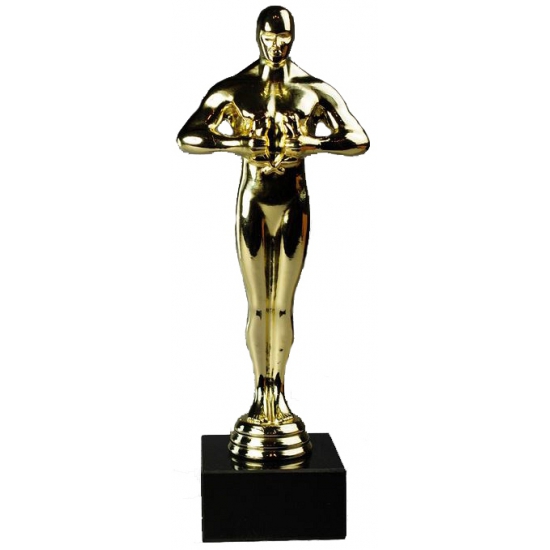 2x luxe award beeldje van 22 cm in het goud. Dit luxe award winaar trofee beeldje heeft een formaat van ongeveer 22 cm. Het beeldje is van het materiaal polypropyleen en de verzwaarde voet is van marmer. Het formaat van de voet is 3 x 6 cm.