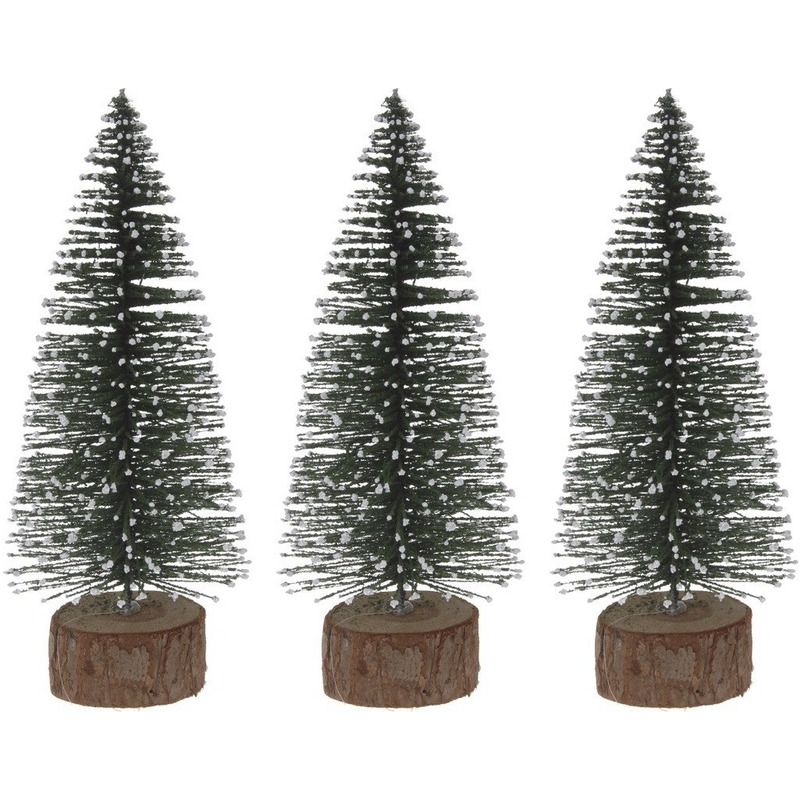 3x mini kerstboompje van 25 cm hoog. Dit miniatuur kerstboompje van 25 cm hoog is perfect als sfeervolle toevoeging aan je kerstdorp, tafelsetting of winterdecoratie. Het groene boompje is subtiel bestrooid met kunst sneeuw en staat stevig op een ronde voet. Gemaakt van kunststof, lichtgewicht en eenvoudig te plaatsen waar je maar wilt.