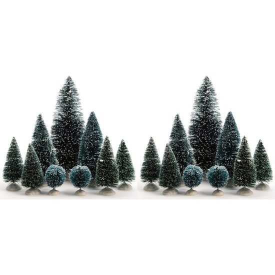 Miniatuur kerstboompjes 18 stuks. Deze decoratie boompjes zijn perfect als decoratie in een kerstdorp of winter landschap. Diverse formaten van 4 tot 22 cm in hoogte. U ontvangt 2 verpakkingen van 9 stuks.