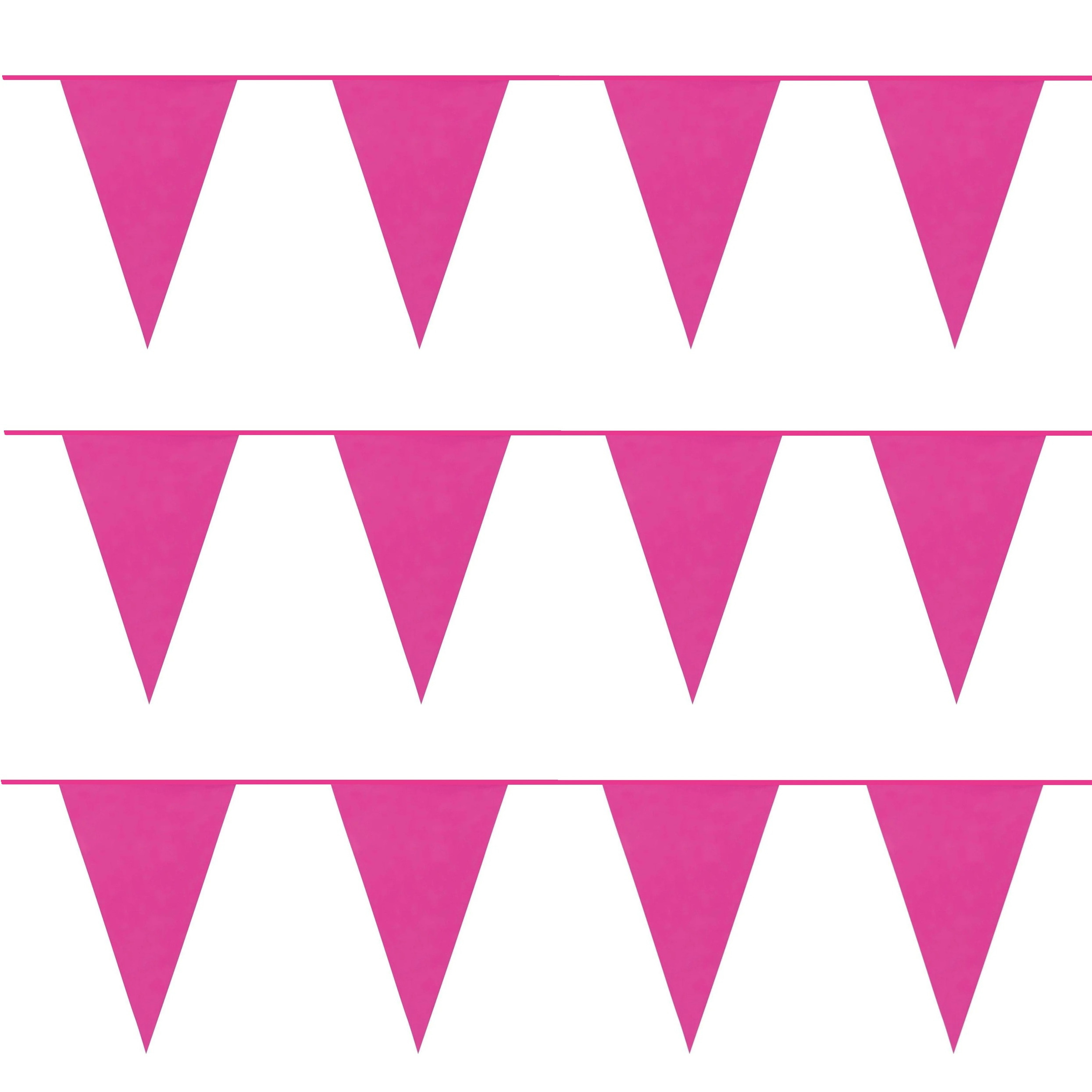 3x party vlaggenlijn met puntvlaggetjes van 10 meter in de kleur fuchsia van plastic. Zin in een feestje? Deze knalrode party vlaggenlijn maakt van elke ruimte een feestlocatie! Met tien meter aan vrolijke puntvlaggetjes zit je altijd goed ? of je nu een verjaardag viert, een BBQ organiseert of gewoon zin hebt in wat extra kleur. De vlaggetjes zijn gemaakt van kunststof, dus ook perfect voor buiten. Ophangen, glimlachen en feesten maar!