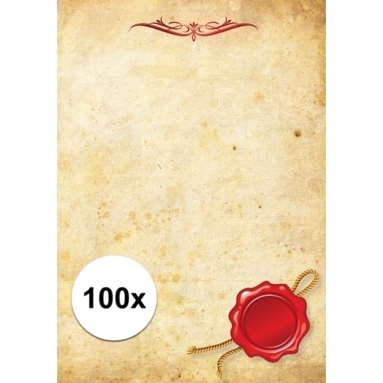 Perkament briefpapier 100x velletje. Een dubbelzijdig bedrukt papieren vel in perkament papier stijl. Leuk voor bijvoorbeeld kado teksten bij een piratenfeest, huwelijk/bruiloft, pensioen, verjaardag, aankondigingen, als oorkonde of voor andere feesten. Formaat: A4. Papier soorten hobby artikelen en feestartikelen.