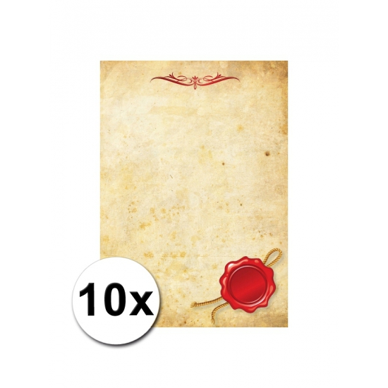 Perkament briefpapier 10x velletje. Een dubbelzijdig bedrukt papieren vel in perkament papier stijl. Leuk voor bijvoorbeeld kado teksten bij een piratenfeest, huwelijk/bruiloft, pensioen, verjaardag, aankondigingen, als oorkonde of voor andere feesten. Formaat: A4. Papier soorten hobby artikelen en feestartikelen.