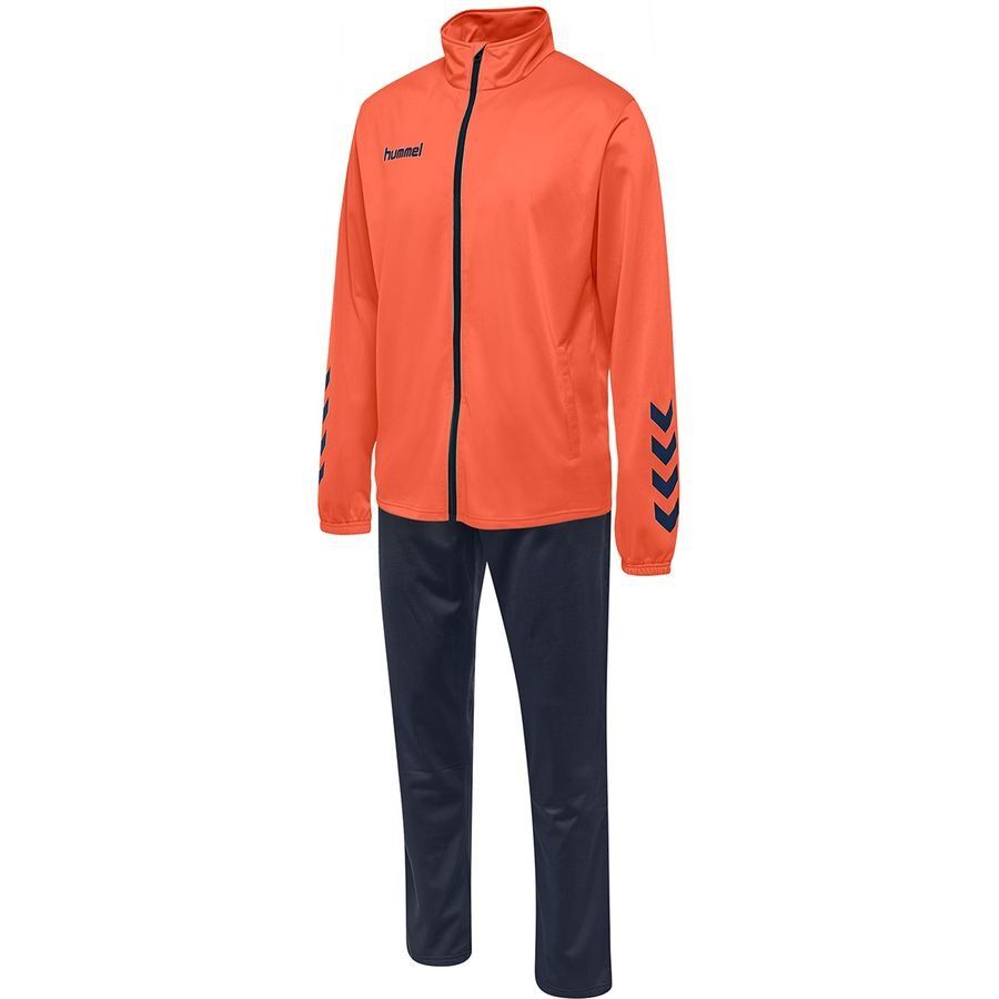 Het hmlPROMO KIDS POLY SUIT is gemaakt van polyester voor prestatiegericht draagcomfort en een strakke afwerking. Het jack met ritssluiting in deze Hummel® trainingspakset heeft een opstaande kraag en twee zijzakken. De broek heeft ook twee zijzakken en een elastische tailleband met trekkoord om de pasvorm vast te zetten.