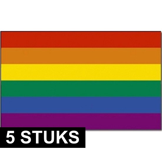 5x regenboog kleuren vlag met afmetingen van 90 x 150 cm. Polyester vlag met regenboog print. De vlag is inclusief 2 ophang ringen. Pride vlaggen decoraties, versieringen.