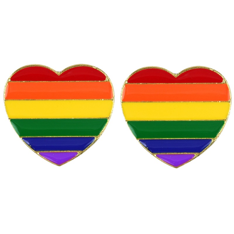 2x regenboog pride hartje pin/broche van 3 cm. Goudkleurige, metalen broche/pin met regenboog print voor bijvoorbeeld op je tas of revers van je jas, maar ook als give-away! Materiaal: metaal. Gay pride/LHBT thema accessoires.
