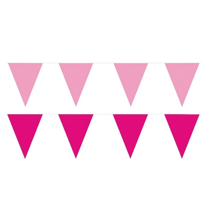 Roze en lichtroze vlaggetjes pakket. Totaal 200 meter vlaggetjes. Materiaal: plastic. , Dit artikel bestaat uit:, 10x Party Vlaggenlijn puntvlaggetjes – kunststof – roze – 10 meter – Slinger – versiering, 10x Party Vlaggenlijn puntvlaggetjes – kunststof – fuchsia – 10 meter – Slinger – versiering