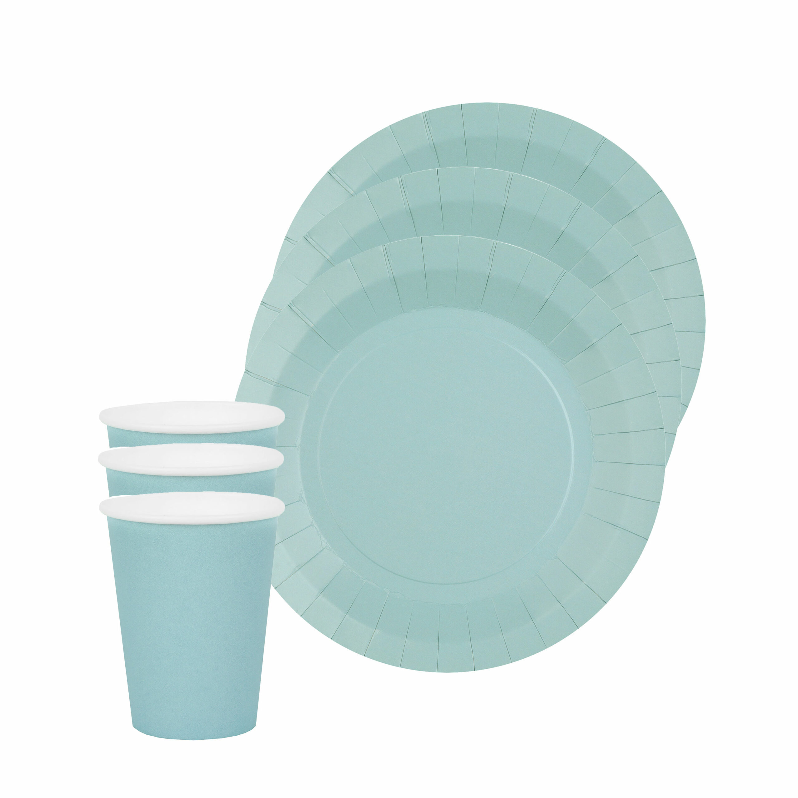 Santex feest/verjaardag servies set bestaande uit 10x feest gebaksbordjes/taartbordjes rond en 10x bekertjes in de kleur lichtblauw. Wegwerp party bordjes en bekers van stevig karton, om ieder feestje mee compleet te maken.