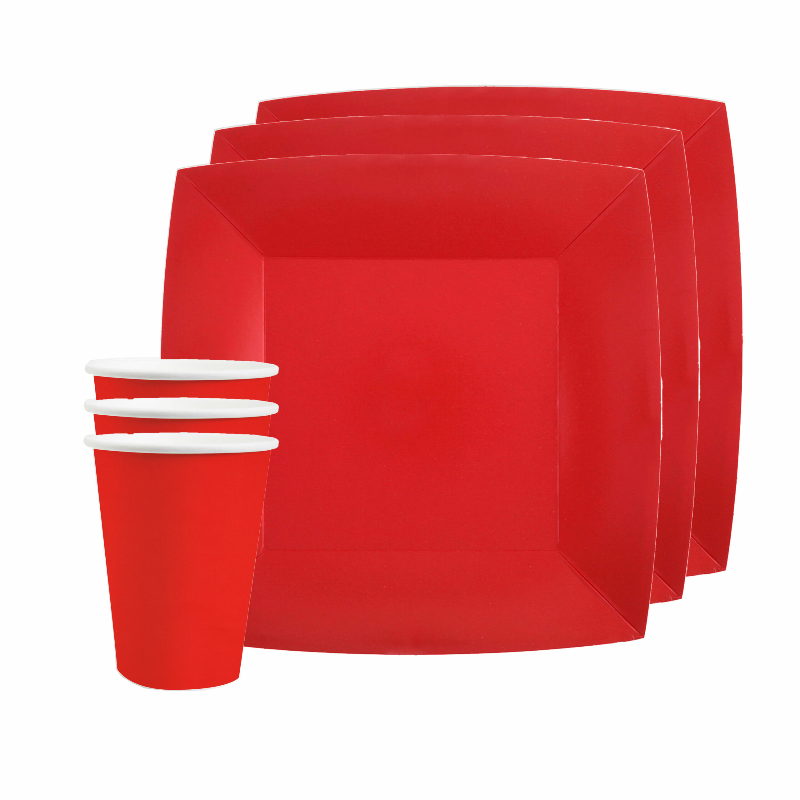 Santex feest/verjaardag servies set bestaande uit 10x feest gebaksbordjes/taartbordjes vierkant en 10x bekertjes in de kleur rood. Wegwerp party bordjes en bekers van stevig karton, om ieder feestje mee compleet te maken.