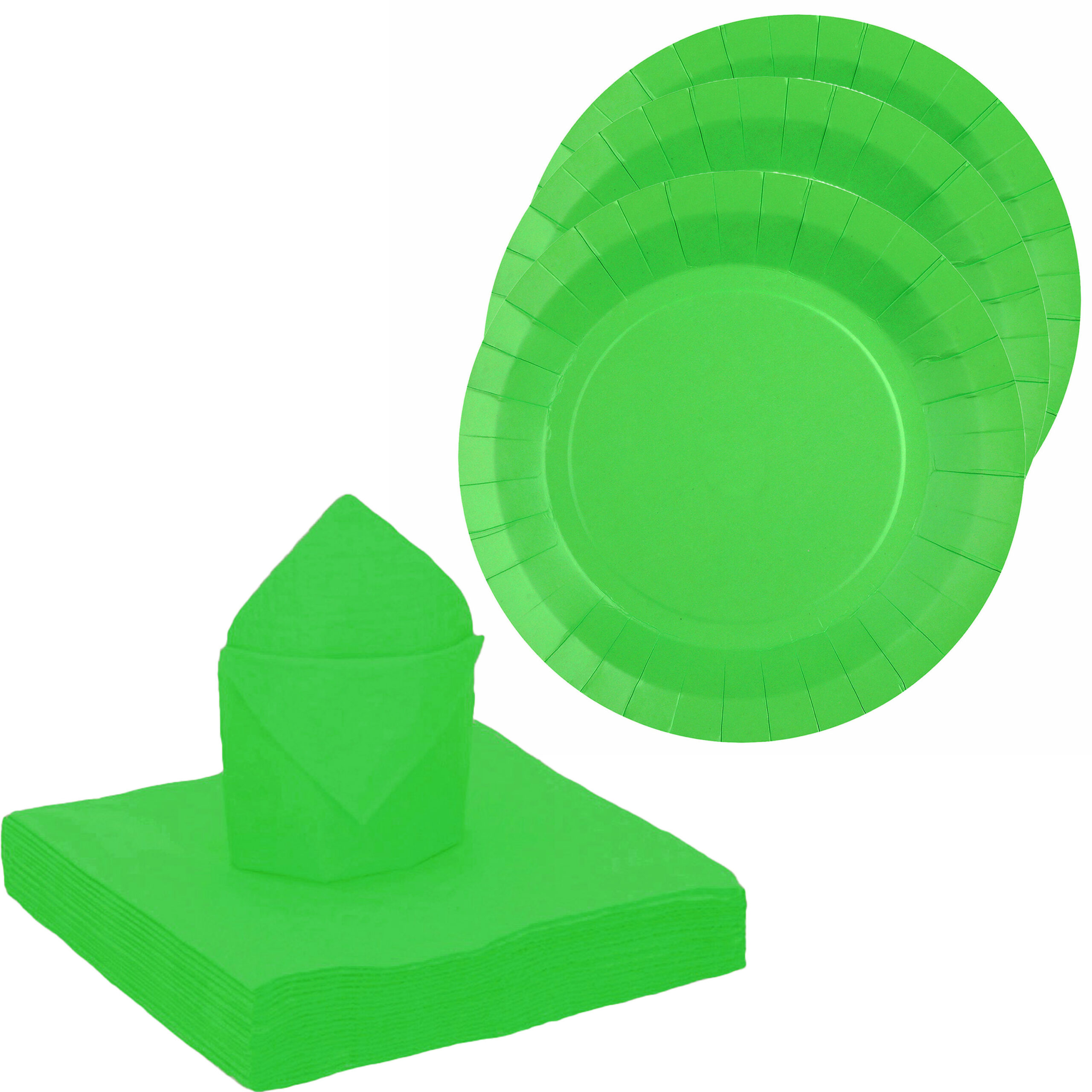 Santex feest/verjaardag servies set bestaande uit 20x feest gebaksbordjes/taartbordjes rond en 25x groot formaat servetten in de kleur felgroen. Wegwerp party bordjes van stevig karton, om ieder feestje mee compleet te maken. De servetten zijn van hoge kwaliteit stevig papier.