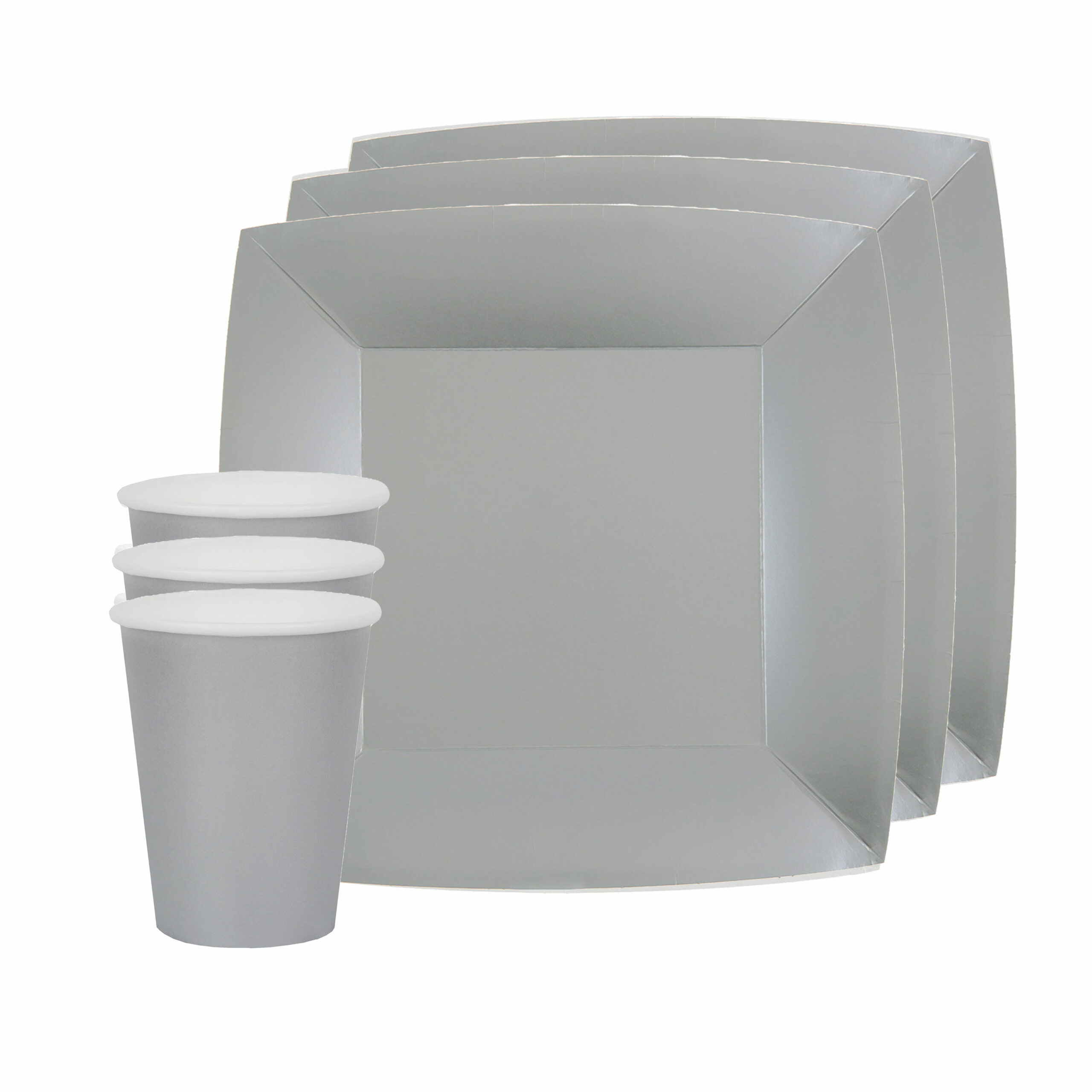 Santex feest/verjaardag servies set bestaande uit 20x feest gebaksbordjes/taartbordjes vierkant en 20x bekertjes in de kleur zilver. Wegwerp party bordjes en bekers van stevig karton, om ieder feestje mee compleet te maken.