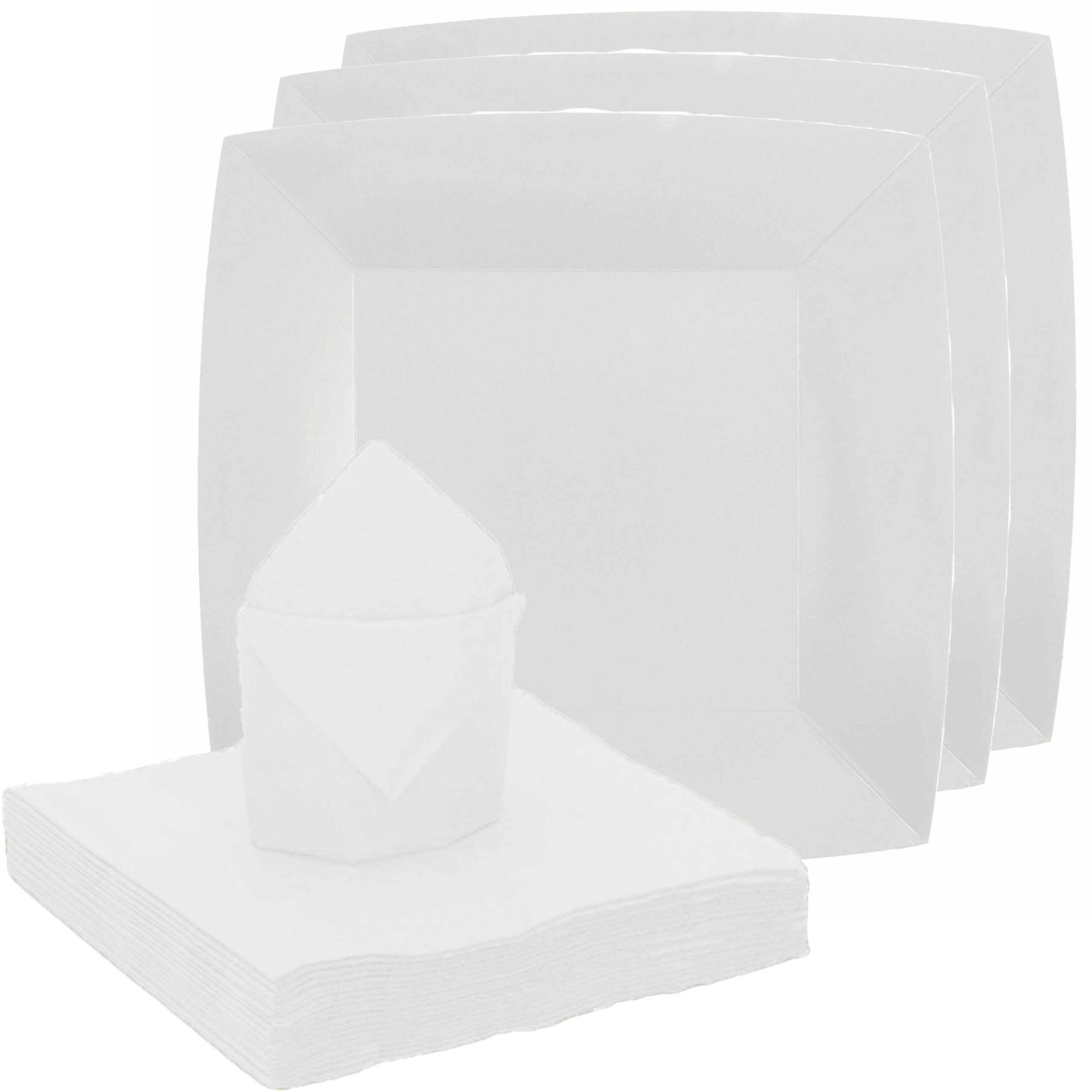 Santex feest/verjaardag servies set bestaande uit 10x feestbordjes vierkant en 25x groot formaat servetten in de kleur wit. Wegwerp party bordjes van stevig karton, om ieder feestje mee compleet te maken. De servetten zijn van hoge kwaliteit stevig papier.