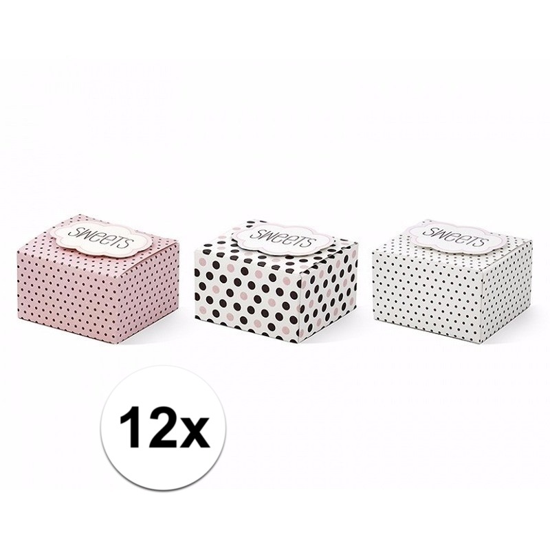 Snoep/bonbon doosjes met stippen, set van 12x stuks. Verras je gasten met deze schattige snoep- of bonbondoosjes! De vrolijke stipjes en de kleurenmix maken ze een feest op zich. Of je nu een bedankje wilt geven of ze gebruikt voor een verjaardag, deze doosjes voegen net dat beetje extra flair toe. De set bevat 6x doosjes, dus je hebt genoeg om je gasten te trakteren op iets lekkers! Maak van je traktatie een feestje ? met deze schattige doosjes wordt alles n?g leuker! U ontvangt 6x doosjes in een mix van 3 ontwerpen. Formaten: ongeveer 6 x 5 cm en 4 x 4 cm.