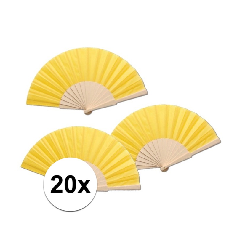 20 stuks spaanse waaier, geel. Deze Spaanse waaier zorgt voor verkoeling tijdens de warme zomerdagen. Deze gele waaier is gemaakt van hout en heeft een formaat van ca. 42 x 23 cm. De handwaaier is ook perfect te gebruiken als verkleedattribuut.
