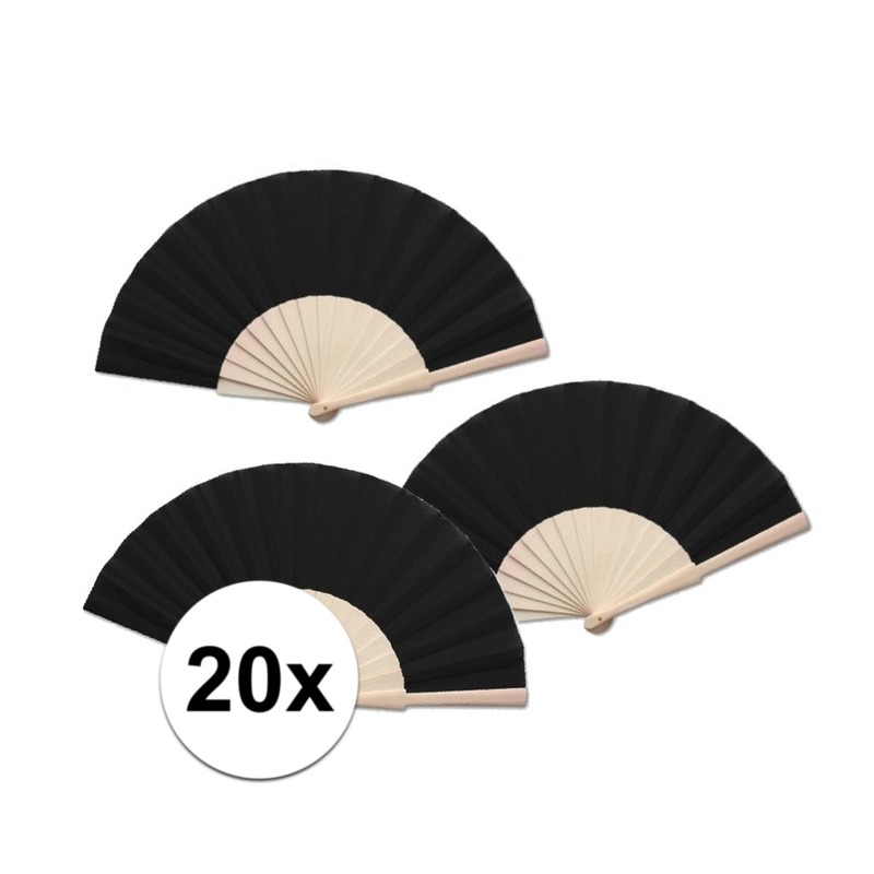 20 stuks spaanse waaier, in het zwart. Deze Spaanse waaier zorgt voor verkoeling tijdens de warme zomerdagen. Deze zwarte waaier is gemaakt van hout en heeft een formaat van ca. 42 x 23 cm. De handwaaier is ook perfect te gebruiken als verkleedattribuut.