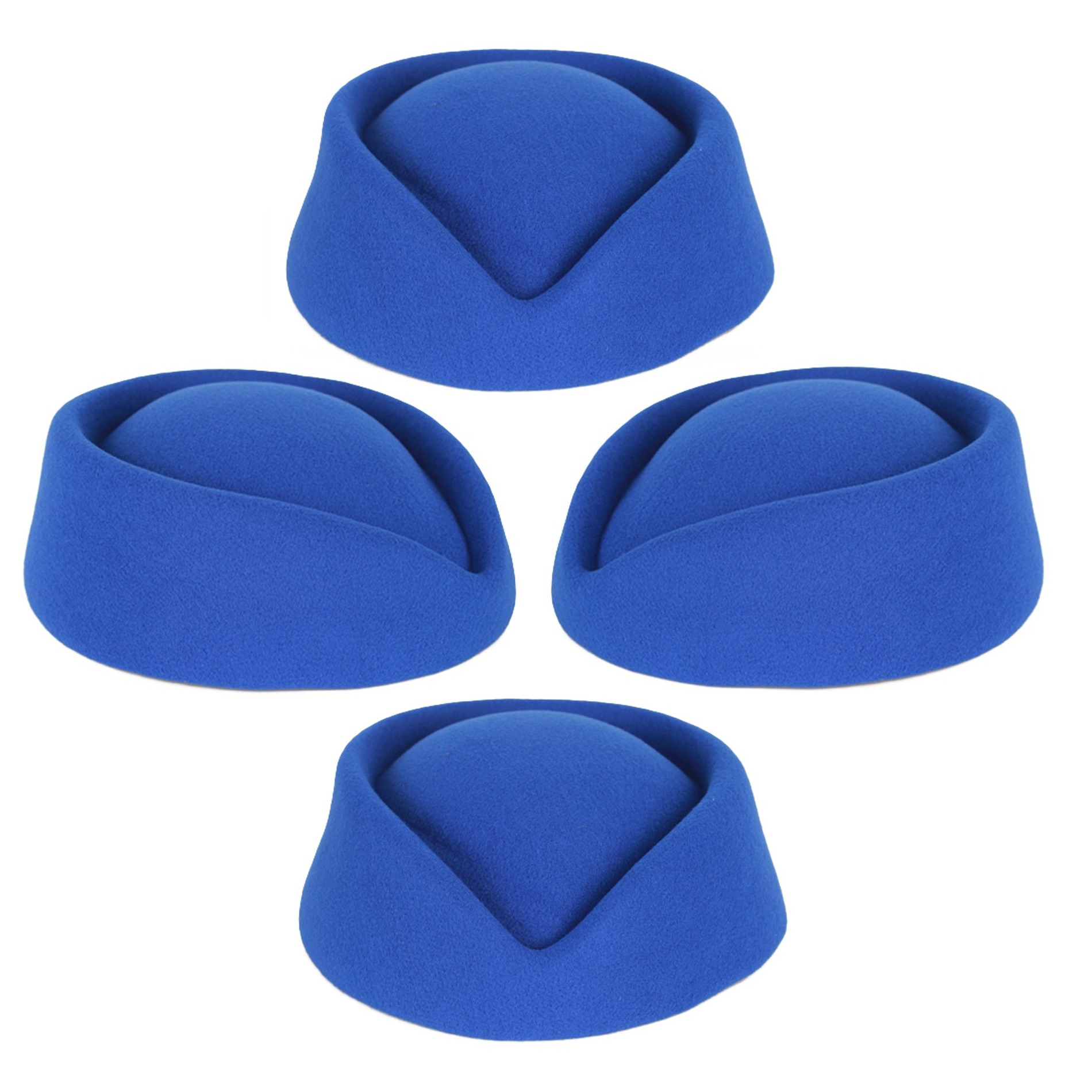 4x blauw stewardessen verkleed hoedje, geschikt voor dames. Materiaal: wolvilt. Omvang: ca. 59 cm. Wasvoorschrift: enkel afnemen met een vochtige doek. Stewardessen verkleedhoeden/carnavals hoeden verkleed accessoire voor dames.