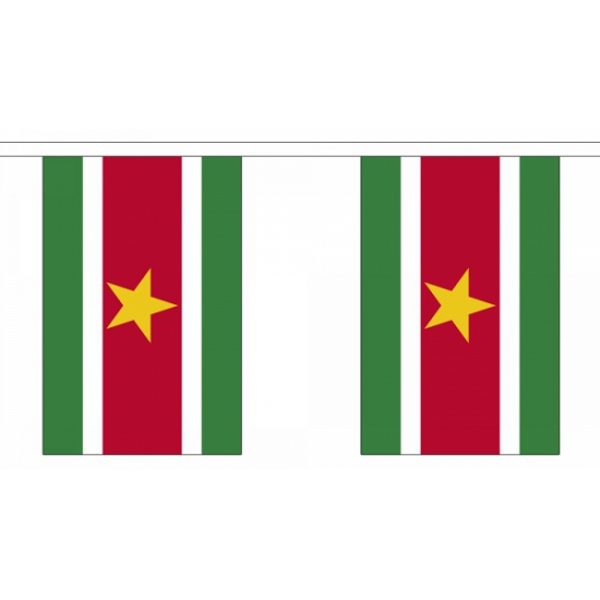 3x luxe Suriname vlaggenlijn van 300 cm. Deze luxe vlaggenlijnen van Suriname is gemaakt van 100% polyester. De vlaggenlijn bevat 10 vlaggetjes met een formaat van 22,5 x 15 cm. Landen versieringen en feestartikelen.