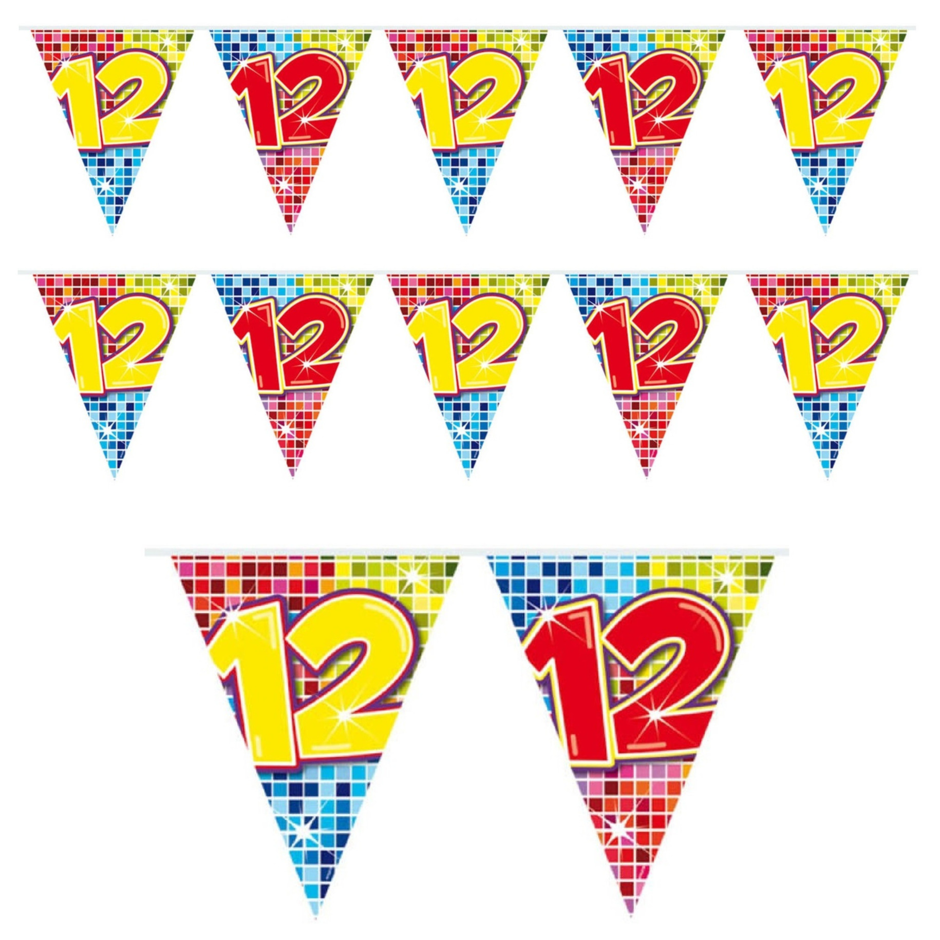 2x mini vlaggenlijn / slinger verjaardag versiering van 12 jaar. De lengte van deze 12ste verjaardag slinger is ca. 3 meter. De hoogte van de vlaggetjes is ca. 14 cm. Materiaal: Plastic. Feestartikelen en versieringen.