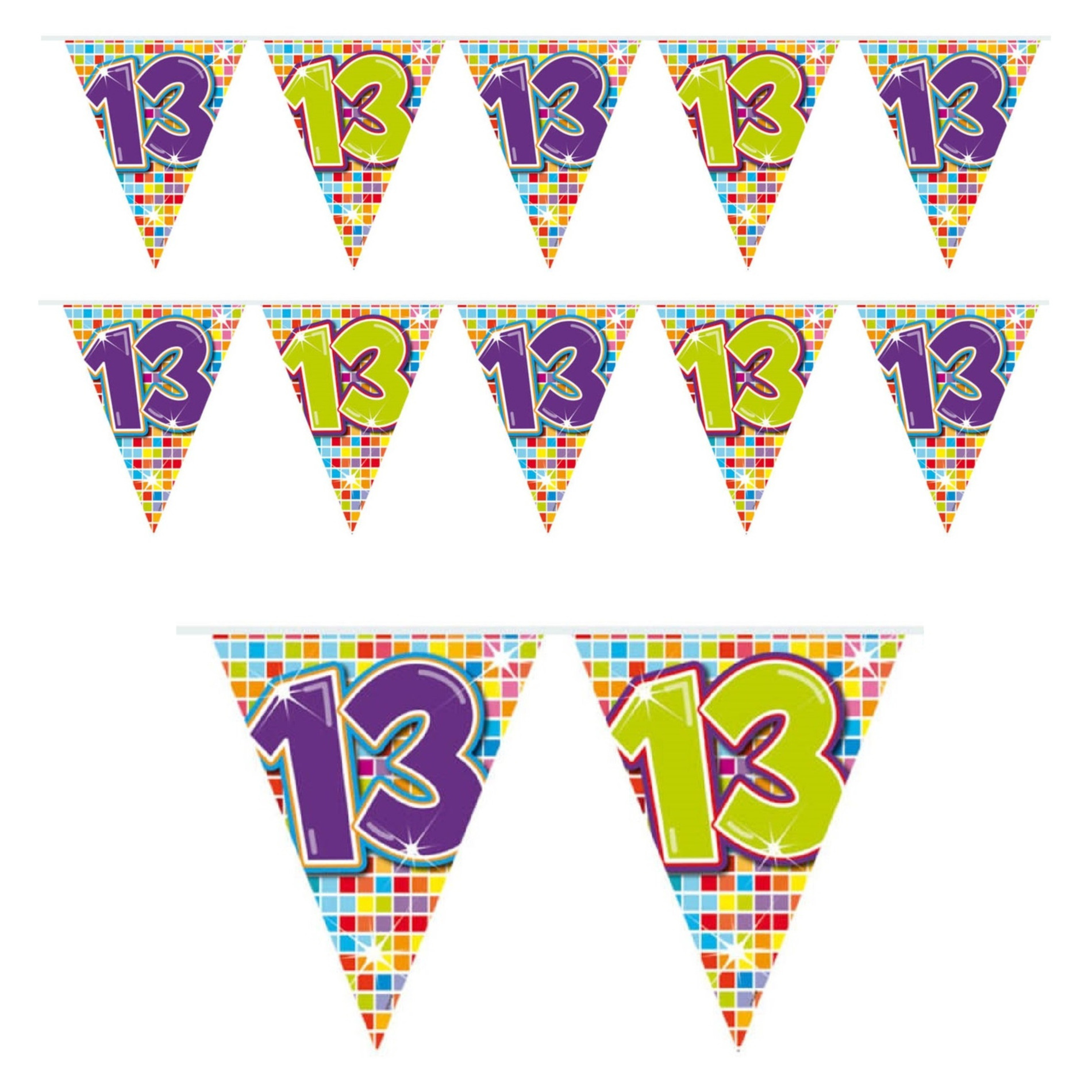 3x mini vlaggenlijn / slinger verjaardag versiering van 13 jaar. De lengte van deze 13ste verjaardag slinger is ca. 3 meter. De hoogte van de vlaggetjes is ca. 14 cm. Materiaal: Plastic. Feestartikelen en versieringen.