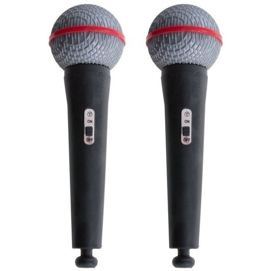 2x kunststof carnaval/ verkleed nep/namaak microfoon van 19 cm. Leuk om je popster of presentator outfit helemaal compleet te maken. Lengte: ongeveer 19 cm. Materiaal: kunststof.