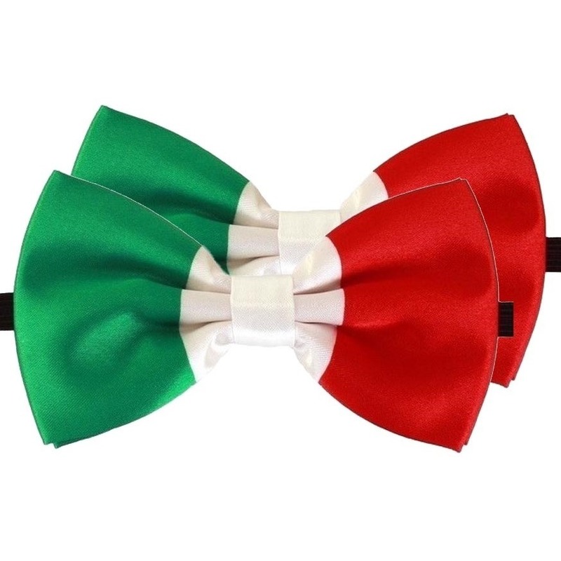 2x groen/wit/rood verkleed vlinderstrikje 12 cm voor dames/heren. Reeds gestrikte das in de kleuren van de Italiaanse vlag. Het satijnen strikje heeft een elastieken band met haak en oog sluiting voor rond de hals, die je kunt verstellen middels een schuifje. Handige strik die je niet zelf hoeft te strikken. Materiaal: polyester, kunststof. Formaat: 12 cm x 6 cm. Thema Carnaval/feest verkleedaccessoires/feestartikelen voor volwassenen. EK/WK landen thema supporters fans producten.