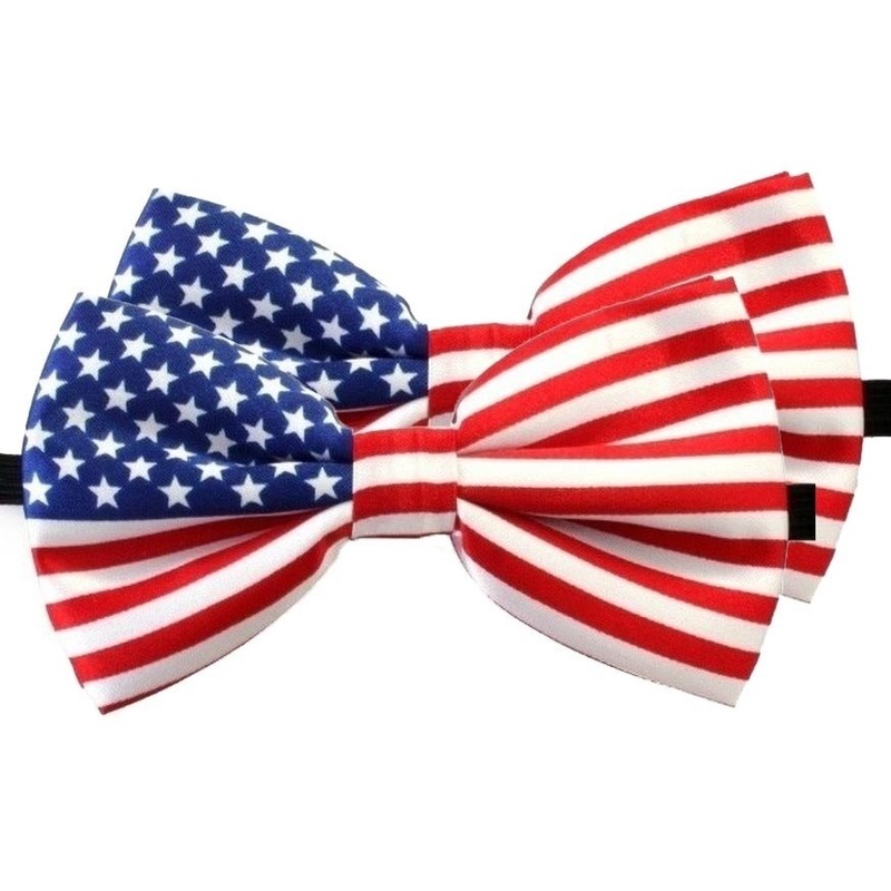2x amerika verkleed vlinderstrikje 12 cm voor dames/heren. Reeds gestrikte das in de kleuren van de Amerikaanse vlag. Het satijnen strikje heeft een elastieken band met haak en oog sluiting voor rond de hals, die je kunt verstellen middels een schuifje. Handige strik die je niet zelf hoeft te strikken. Materiaal: polyester, kunststof. Formaat: 12 cm x 6 cm. Thema Carnaval/feest verkleedaccessoires/feestartikelen voor volwassenen. EK/WK landen thema supporters fans producten.