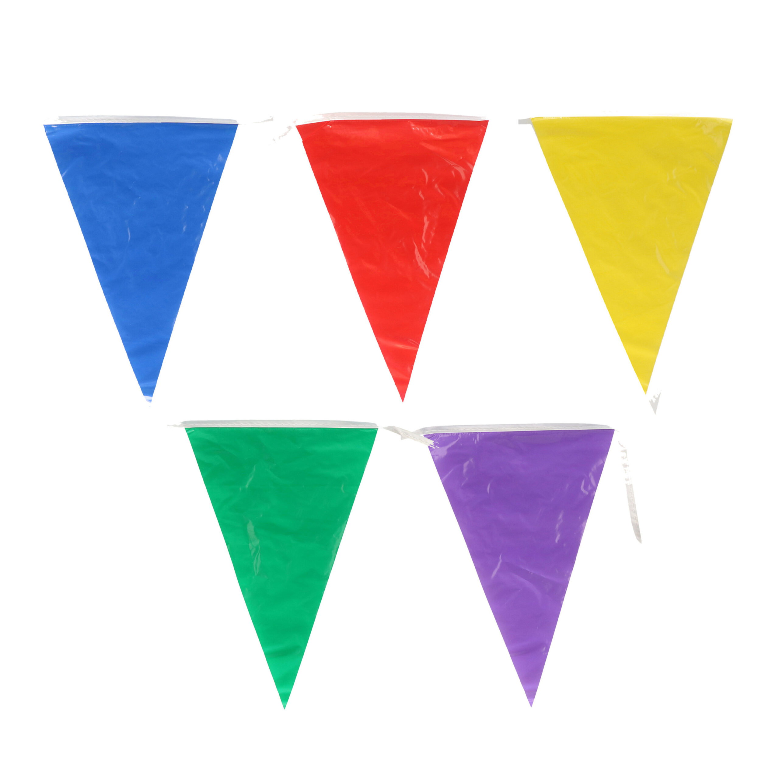 3x vrolijk gekleurde vlaggenlijn voor binnen en buiten gebruik. Kleuren: rood, geel, blauw, groen, paars, roze. Materiaal: plastic. De vlaggenlijn heeft een totale lengte van ongeveer 10 meter waarvan 6 meter met vlaggetjes en 2 meter koord aan weerzijden om de vlaggenlijn vast te maken. Formaat vlaggetje: 20 x 30 cm en de lijn is 10 meter lang.