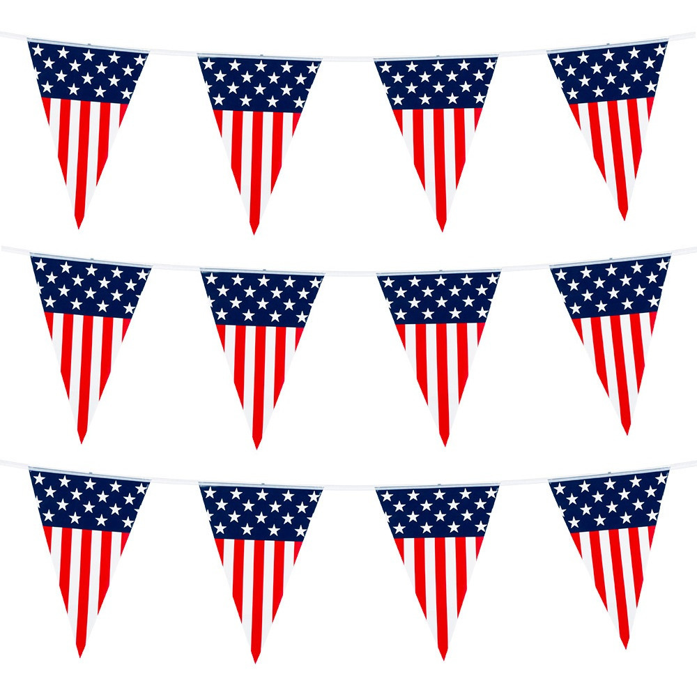 5x vlaggenlijn of vlaggetjes Amerika/USA van 6 meter. Vlaggenlijn met Amerikaanse vlag print. De vlaggenlijn is gemaakt van plastic. De vlaggenlijn is 6 meter lang en heeft ca 2 meter ophanglijn. De vlaggetjes zijn ca 30 x 20 cm groot. Deze vlaggenlijn is geschikt voor binnen en buiten gebruik, echter is deze niet UV-bestendig. Landen versieringen.