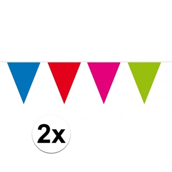 2x vlaggenlijn in XL formaat vlaggetjes, in de kleur multicolour. Deze vlaggenlijn is gemaakt van plastic. De vlaggenlijn bevat 15 vlaggetjes met een afmeting van 42 x 28 cm. Geschikt voor binnen gebruik. De vlaggenlijn heeft een totale lengte van ongeveer 11 meter waarvan 10 meter met vlaggen en 42 cm meter koord aan weerzijden om de vlaggenlijn vast te maken. Feestartikelen en versieringen.