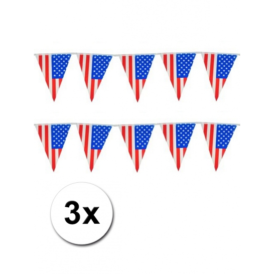 3x vlaggenlijn USA/Amerika 10 meter. Plastic vlaggenlijnen in de kleuren van de USA. Geschikt voor binnen en buiten gebruik. Afmeting vlaggetje is circa 20 x 30 cm. Amerikaanse decoratie feestartikelen en versieringen. Thema USA.