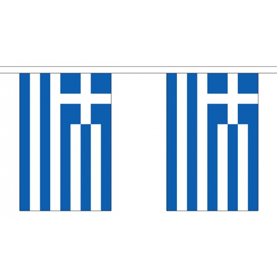 2x polyester vlaggenlijn/vlaggetjes van land Griekenland met lengte van 300 cm. Stoffen vlaggenlijn van Griekenland voor binnen en buiten gebruik. Deze luxe vlaggenlijn heeft 10 vlaggetjes van 22,5 x 15 cm. Landen versieringen.