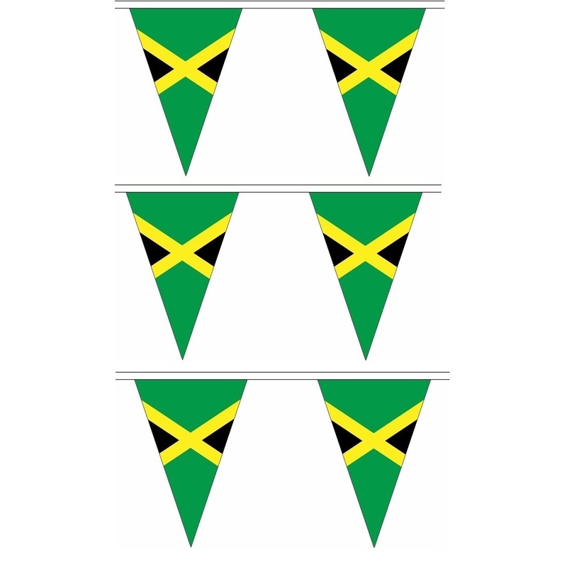 3x polyester vlaggenlijn Jamaica van 5 meter. Stoffen Jamaicaanse vlaggenlijn van 100% polyester. De lengte van deze vlaggenlijn is ongeveer 5 meter en de grootte per vlaggetje is ongeveer 30 x 20 cm. Er zitten 12 vlaggetjes aan de vlaggenlijn en de vlaggenlijn kan zowel binnen als buiten worden opgehangen. Landen versiering.