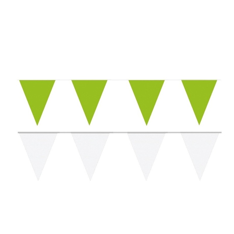 Witte en groene vlaggetjes pakket. Totaal 80 meter vlaggetjes. Materiaal: plastic. , Dit artikel bestaat uit:, 4x Party Vlaggenlijn puntvlaggetjes – kunststof – wit – 10 meter – Slinger – versiering, 4x Party Vlaggenlijn puntvlaggetjes – kunststof – groen – 10 meter – Slinger – versiering