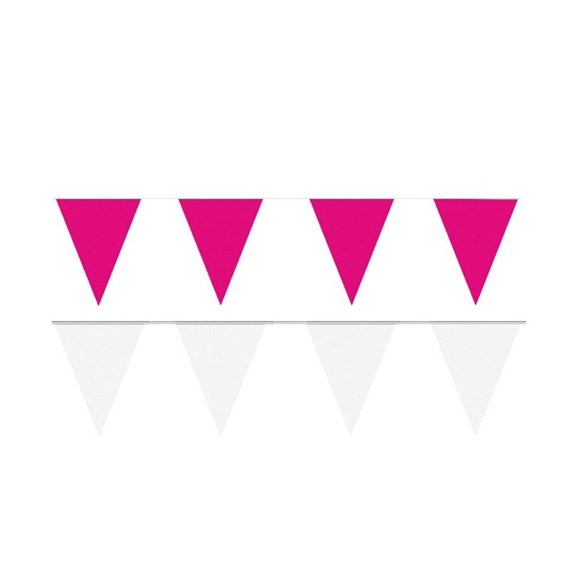 Witte en roze vlaggetjes pakket. Totaal 120 meter vlaggetjes. Materiaal: plastic. , Dit artikel bestaat uit:, 6x Party Vlaggenlijn puntvlaggetjes – kunststof – wit – 10 meter – Slinger – versiering, 6x Party Vlaggenlijn puntvlaggetjes – kunststof – fuchsia – 10 meter – Slinger – versiering