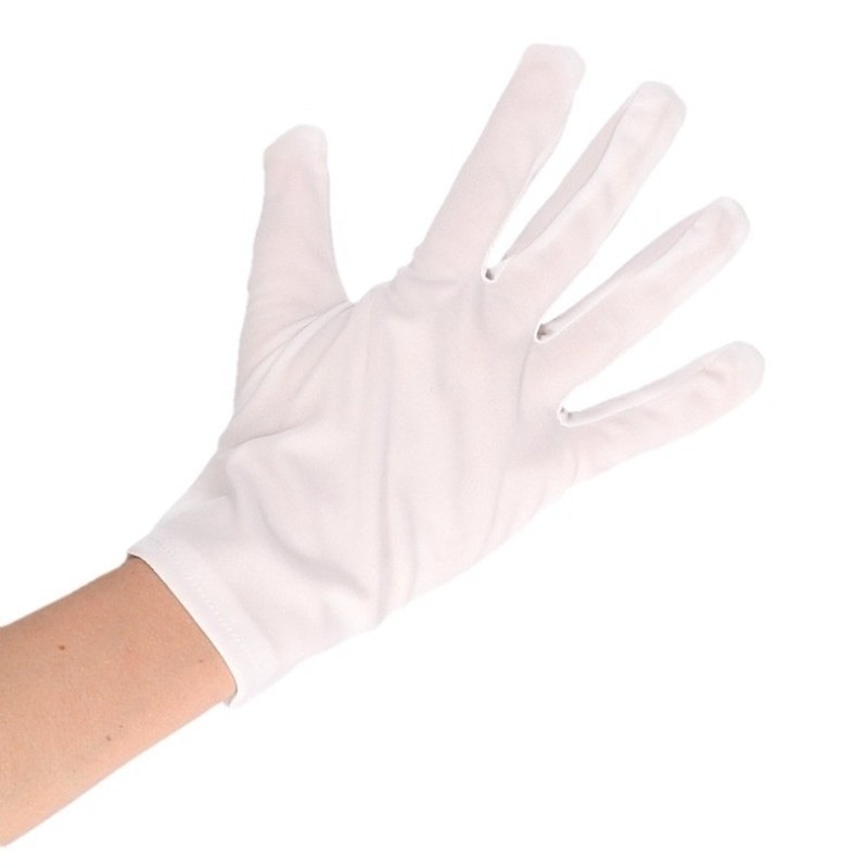 Witte korte Sinterklaas handschoenen voor volwassenen. Korte witte handschoenen, geschikt voor volwassenen. Een leuke toevoeging bij een verkleedoutfit! Maat: One size, past tot maat L. Materiaal: 100% stretch polyester.
