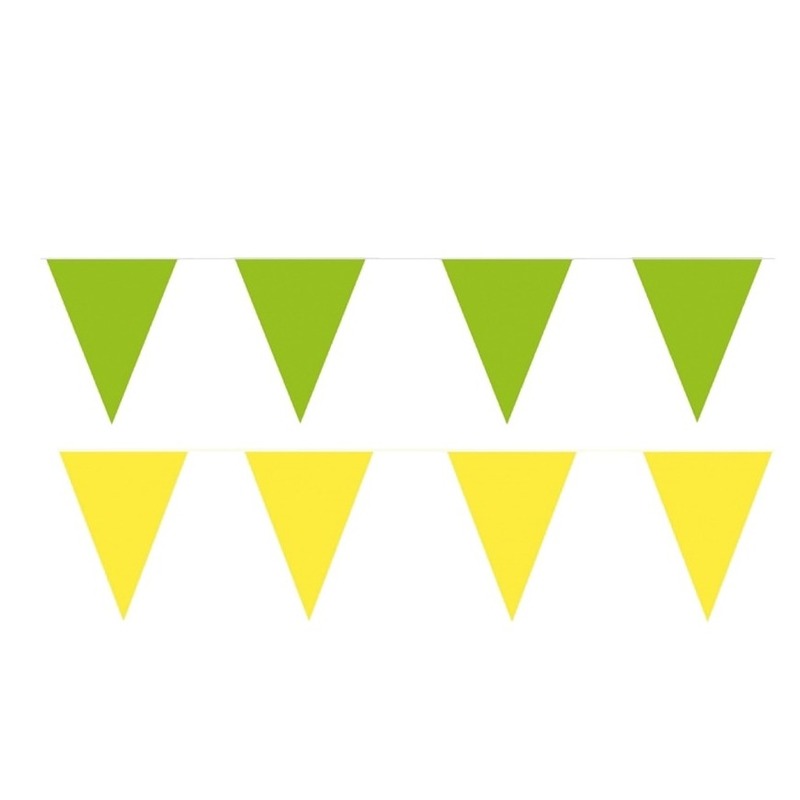 Gele en groene vlaggetjes pakket. Totaal 80 meter vlaggetjes. Materiaal: plastic. , Dit artikel bestaat uit:, 4x Party Vlaggenlijn puntvlaggetjes – kunststof – geel – 10 meter – Slinger – versiering, 4x Party Vlaggenlijn puntvlaggetjes – kunststof – groen – 10 meter – Slinger – versiering